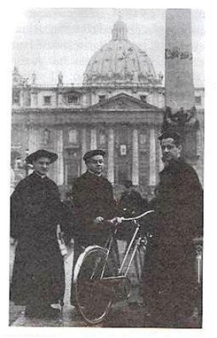 Fotografía de los padres Agustín Correa, Eduardo Acosta y García Herreros con una bicicleta, dentro de la ciudad del vaticano al fondo podemos ver la Basílica de San Pedro y el Obelisco vaticano.
