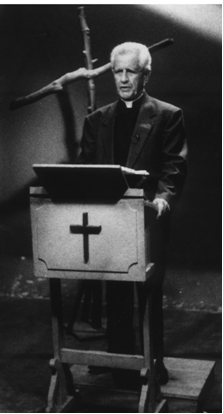 Fotografía del padre Rafael García Herreros grabando el programa “Minuto de Dios” en Lumen 2000 para todos los televidentes. Tiene como escenario la cruz y un atril.