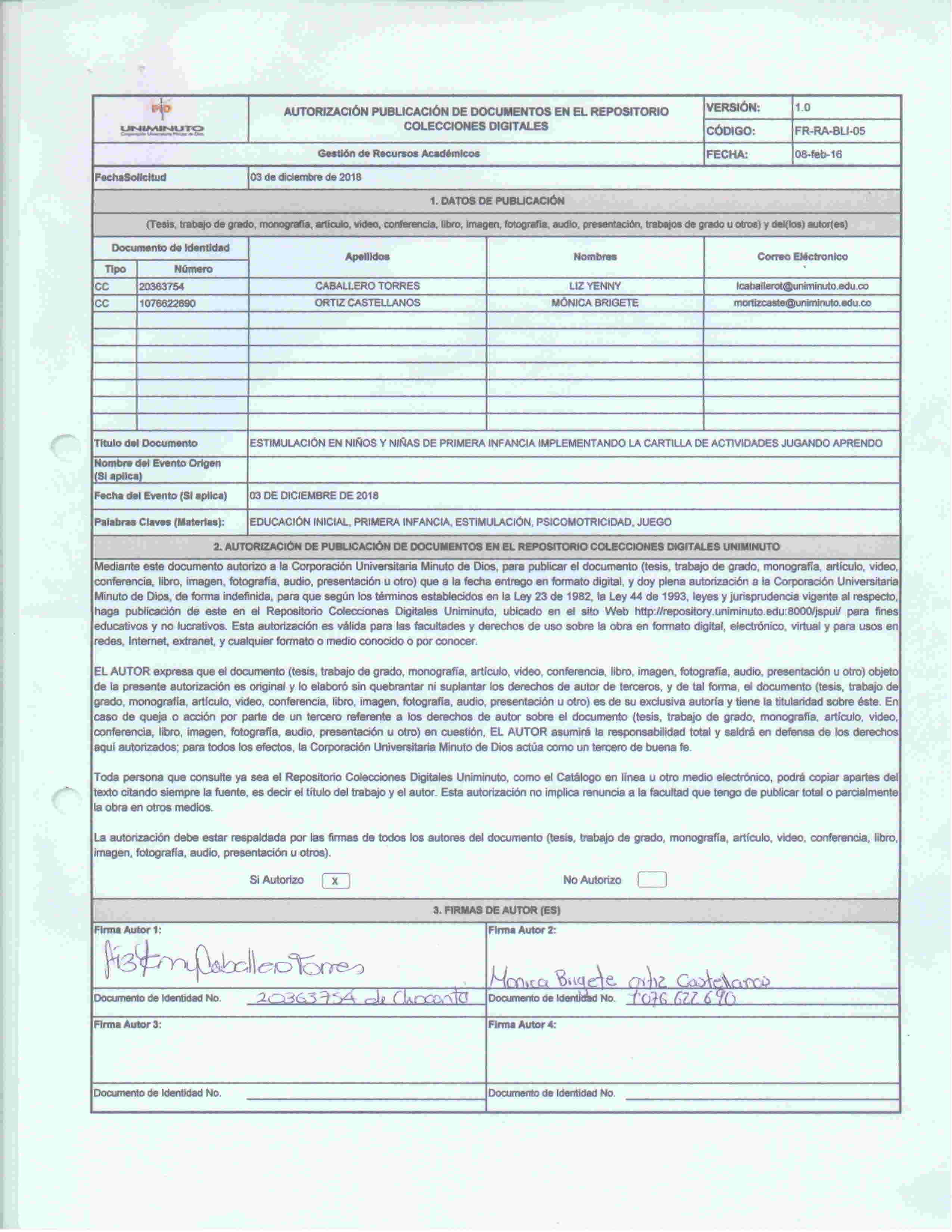 | dc.identifier.citation | Caballero, L. y Ortiz, M. (2018). Estimulación en niños y niñas de primera infancia implementando la cartilla de actividades “jugando aprendo”. (Trabajo de grado). Corporación Universitaria Minuto de Dios, Zipaquirá - Colombia. | es_ES |