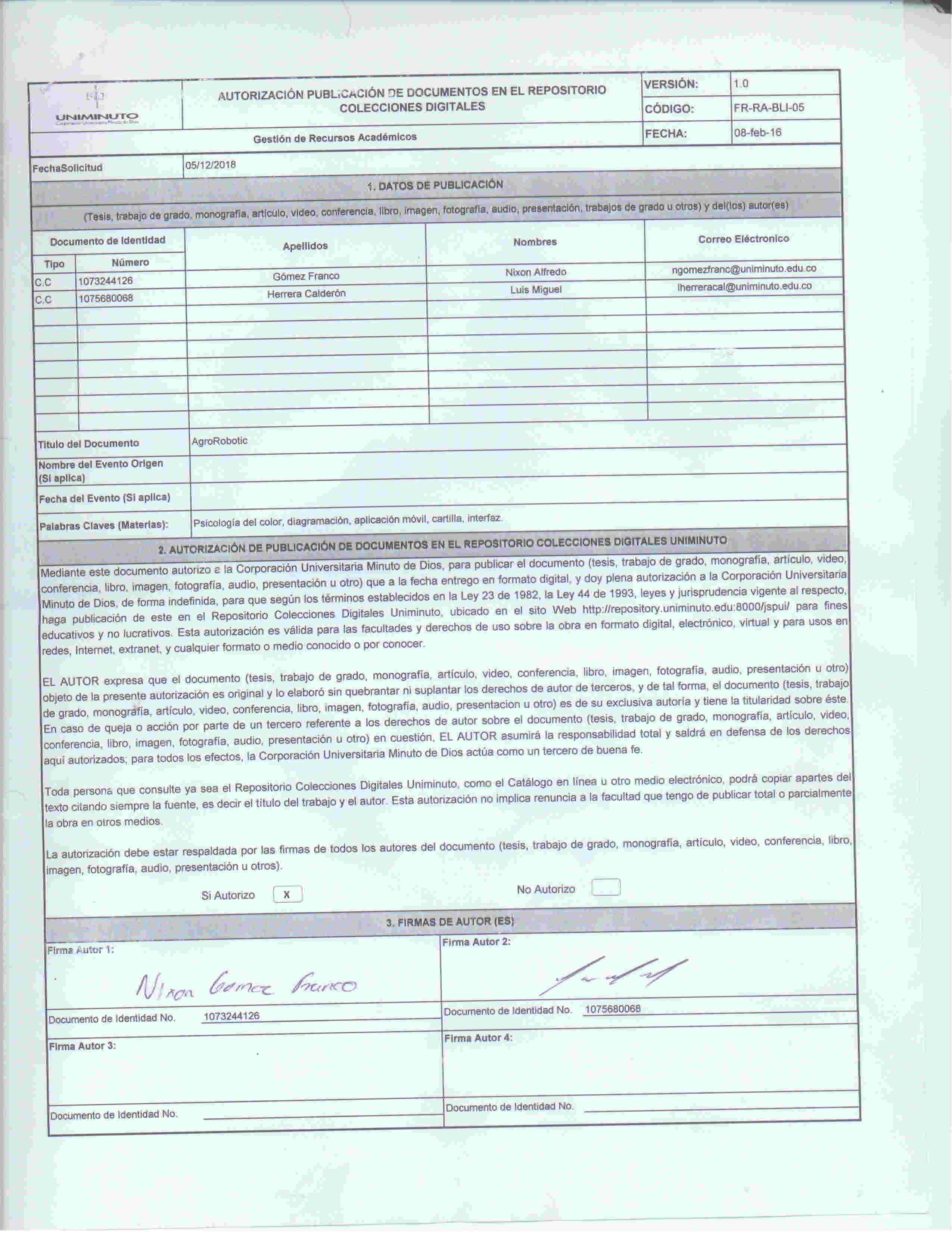 | dc.identifier.citation | Herrera, L & Gomez, N; (2018); AgroRobotic; (Trabajo de grado); Corporación Universitaria Minuto de Dios; Zipaquira - Colombia | SPA |