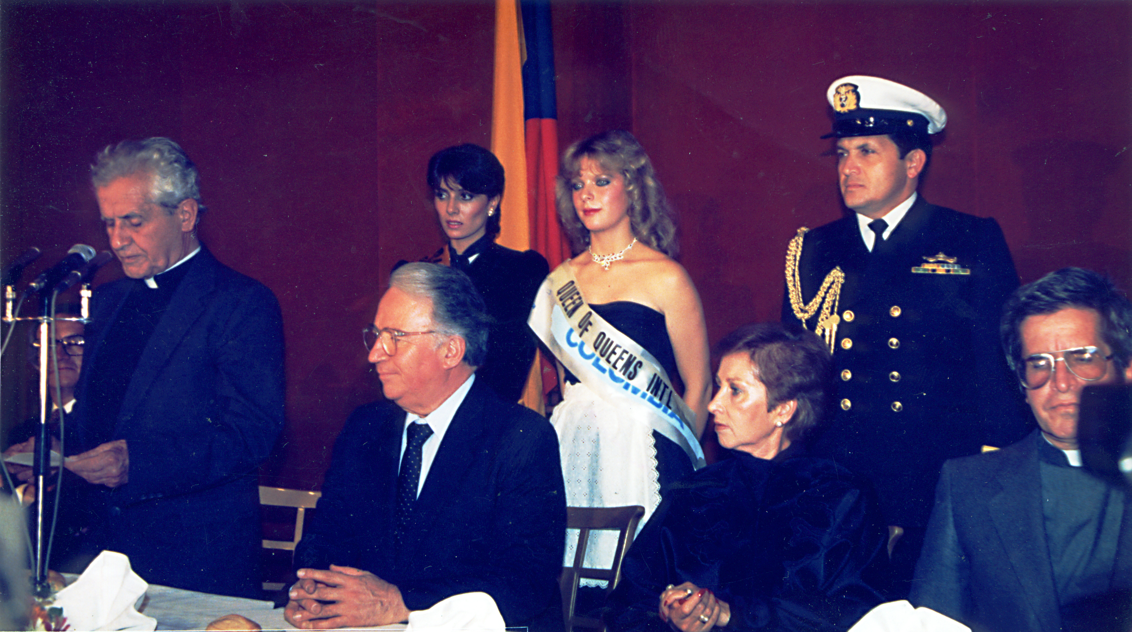 Alocución del padre Rafael García Herreros en el Banquete del Millos, El cual se encuentra acompañado del ex - presidente Belisario Betancur, el Padre Diego Jaramillo, la reina y su edecán.