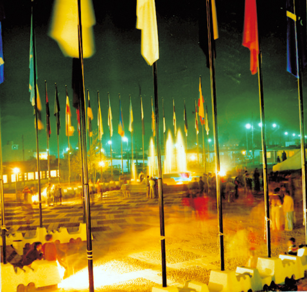Parque de banderas del Museo de Arte contemporáneo .fotografía en la que se observa las banderas de diferentes países y al fondo una fuente de agua tricolor.
